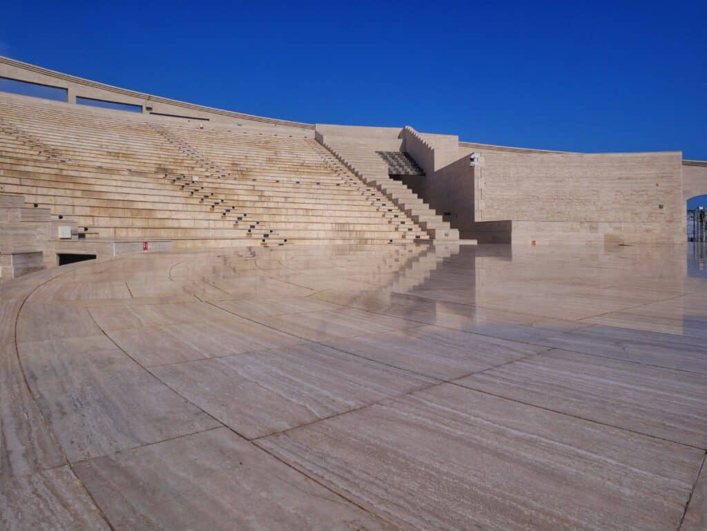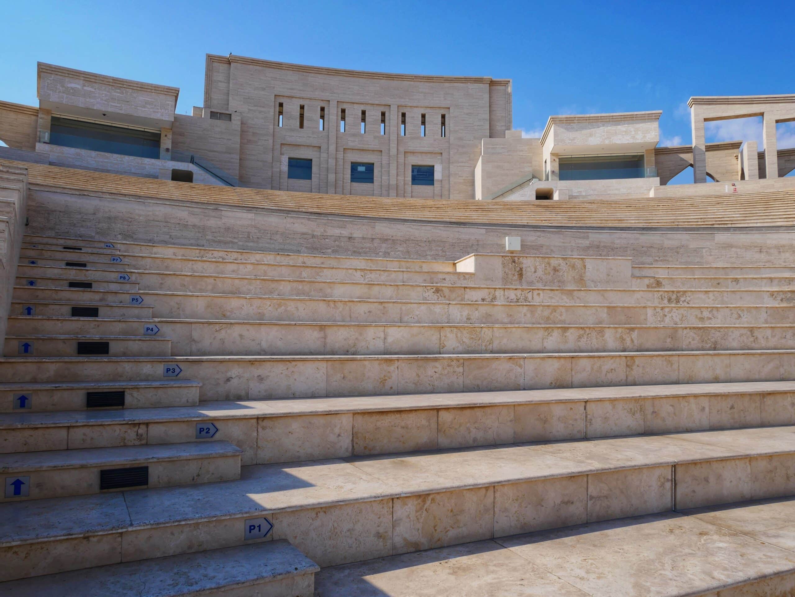 L’Amfiteatre, en qüestió, aquest edifici públic propietat de l’Estat de Qatar, és una obra de curta durada però eficient que respon a un ambiciós projecte inscrit en les arquitectures avantguardistes i més punteres de la ciutat; i, constitueix, a grans trets, una quimèrica reproducció d’aquells amfiteatres dels esplendorosos dies de la Grècia clàssica. Es tracta d’una estructura estable, de disposició semi-circular, orientada per a una acústica dilatada i perifèrica, aixecada amb múltiples fragments de pedra arenosa, travertina i calcària, de tonalitats clares i lluminoses; tot conformant, en una superfície de 3275 metres quadrats i amb un aforament per a 5000 espectadors, uns admirables elements constructius –murs, arcs, pilars, etcètera- de patró pròpiament local que li atorguen una identitat pròpia a tota la construcció.