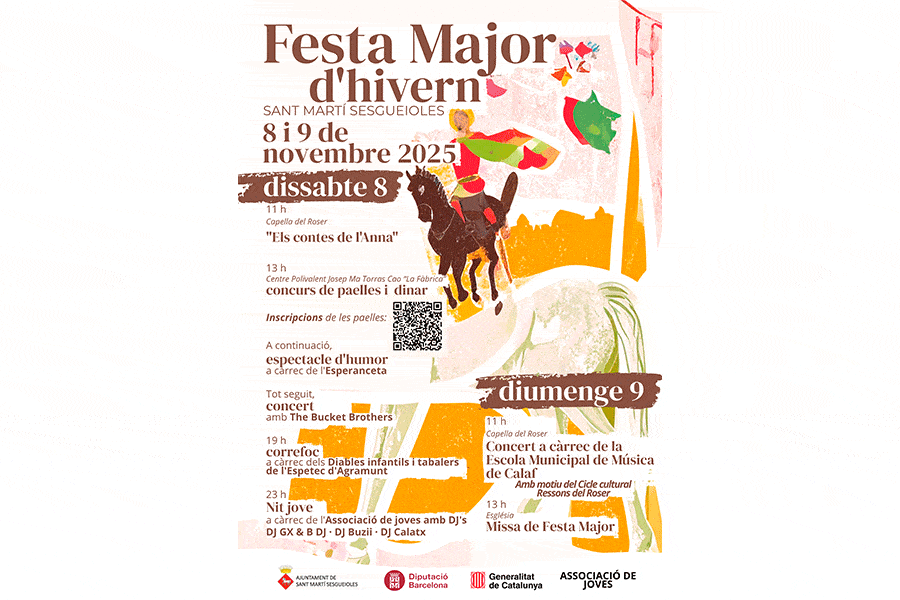 La Festa Major d’Hivern 2025 de Sant Martí Sesgueioles compta amb el suport de la Diputació de Barcelona, la Generalitat de Catalunya i l’Associació de Joves de Sant Martí Sesgueioles.