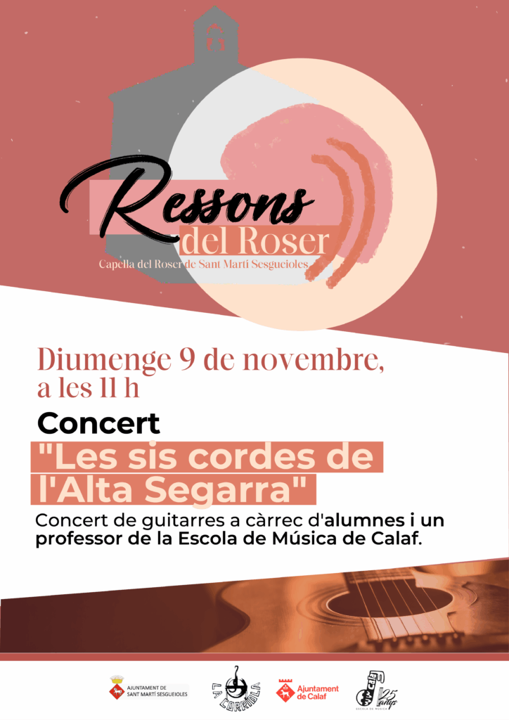 El diumenge 9 de novembre, a les 11:00 h a la Capella del Roser, es podrà gaudir del concert de l’Escola de Música de Calaf, dins del Cicle de Ressons del Roser, i a les 13:00 h tindrà lloc la Missa de Festa Major a l’església parroquial.