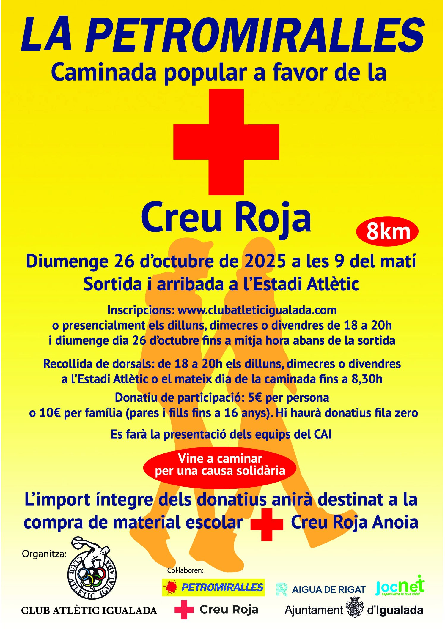 El Club Atlètic Igualada organitza la 4a edició de la Caminada Popular Solidària LA PETROMIRALLES, que es durà a terme aquest diumenge 26 d’octubre, a partir de les 9h. La caminada, no competitiva i oberta a tothom, té l’objectiu de ser un recorregut plàcid i familiar de 8 Km., amb…