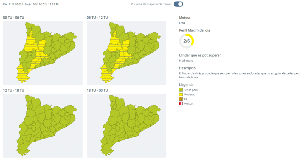El Servei Meteorològic de Catalunya ha emès un avís de situació meteorològica de perill per fred intens a l’Anoia entre la mitjanit del 30 de desembre, i el migdia del dimarts 31 de desembre. En altres comarques de Catalunya està previst que l’episodi de fred intens es repeteixi també la nit del 31 a l’1.