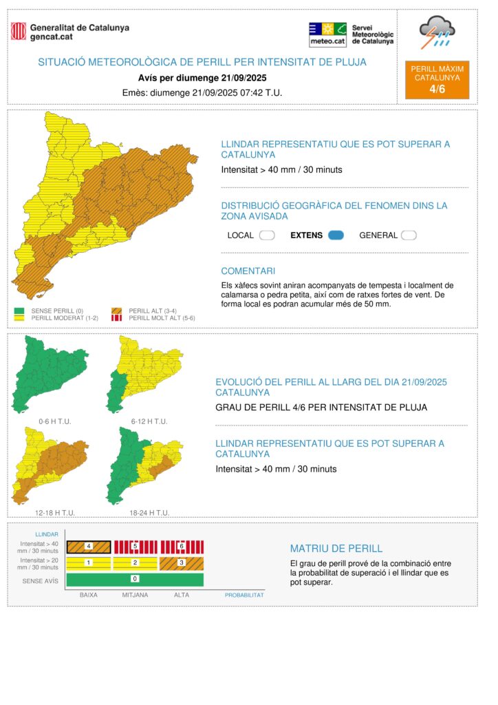 Segons el Servei Meteorològic de Catalunya (SMC), a partir de les 08.00 hores del matí d’aquest diumenge i fins a migdia, es preveuen precipitacions moderadament intenses que poden superar els 20 litres en 30 minuts.