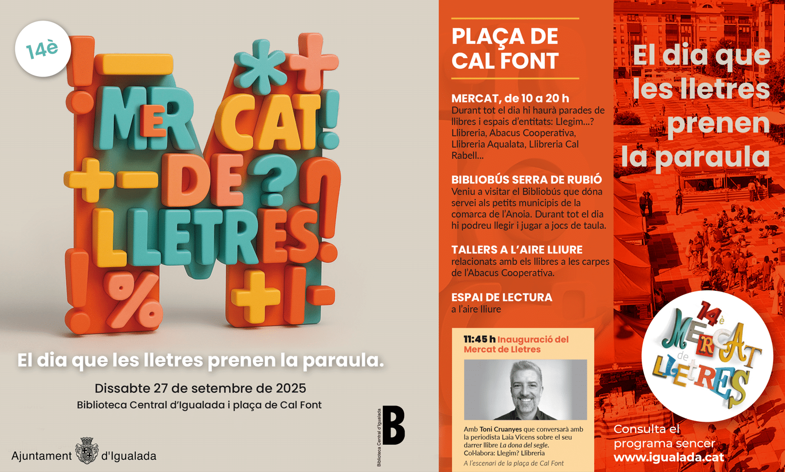 La història, la poesia i els tallers d’il·lustració seran els protagonistes del 14è Mercat de Lletres d’Igualada que un any més organitza la Biblioteca Central d’Igualada a Cal Font. Dissabte i durant tot el dia autors, il·lustradors, contistes i llibreries ompliran la Biblioteca i la plaça de Cal Font de lectures i cultura. Els principals convidats de l’edició d’enguany seran Toni Cruanyes, Jaume Clotet, Blanca Llum Vidal, Marta Bellvehí i la companyia de teatre anoienca Príncep Totilau.
