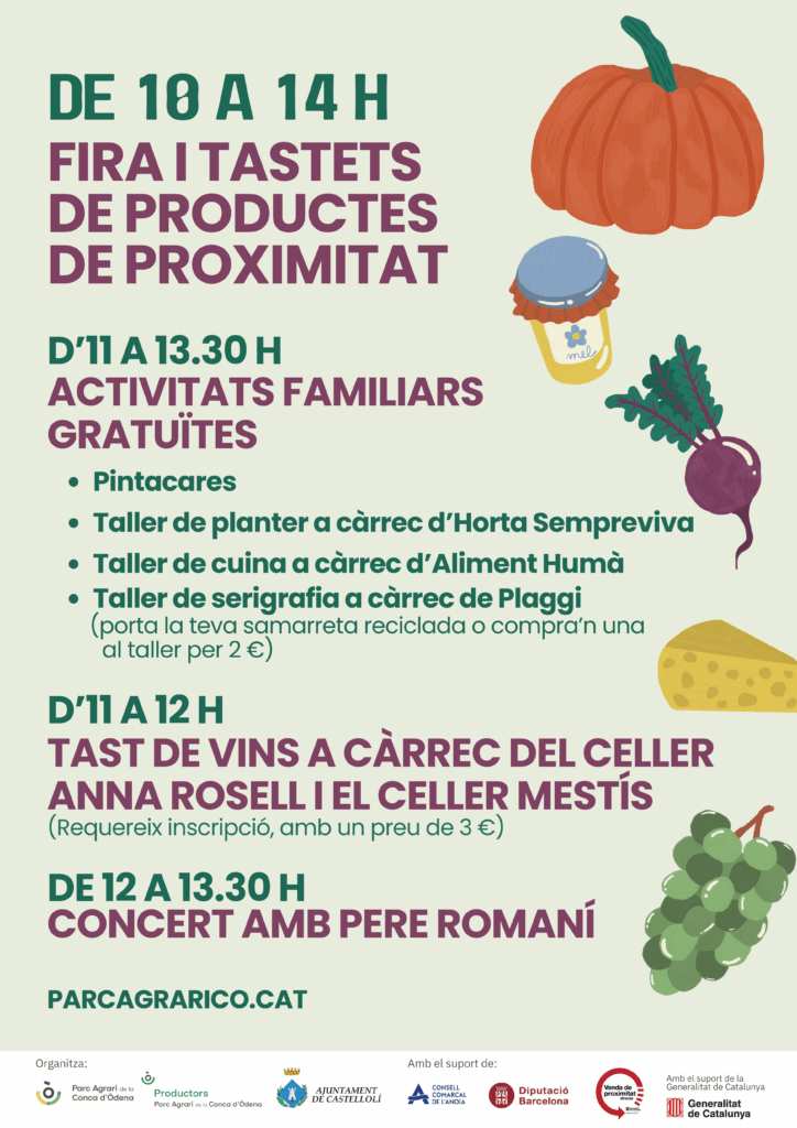 Durant la jornada, els assistents podran degustar i comprar productes directament a les parades dels agricultors i ramaders del Parc Agrari, gaudir de música en directe i participar en activitats familiars i tallers relacionats amb el món agrícola i alimentari.