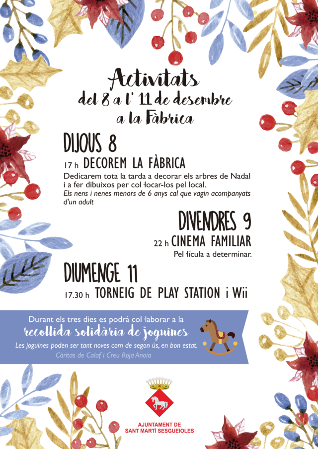 El primer dijous 8, ens prepararem pel Nadal i a les 17 hores decorarem La Fàbrica amb arbres nadalencs i dibuixos que farem el mateix dia. Els nens i nenes menors de 6 anys que hi participin cal que vagin acompanyats d’un adult.