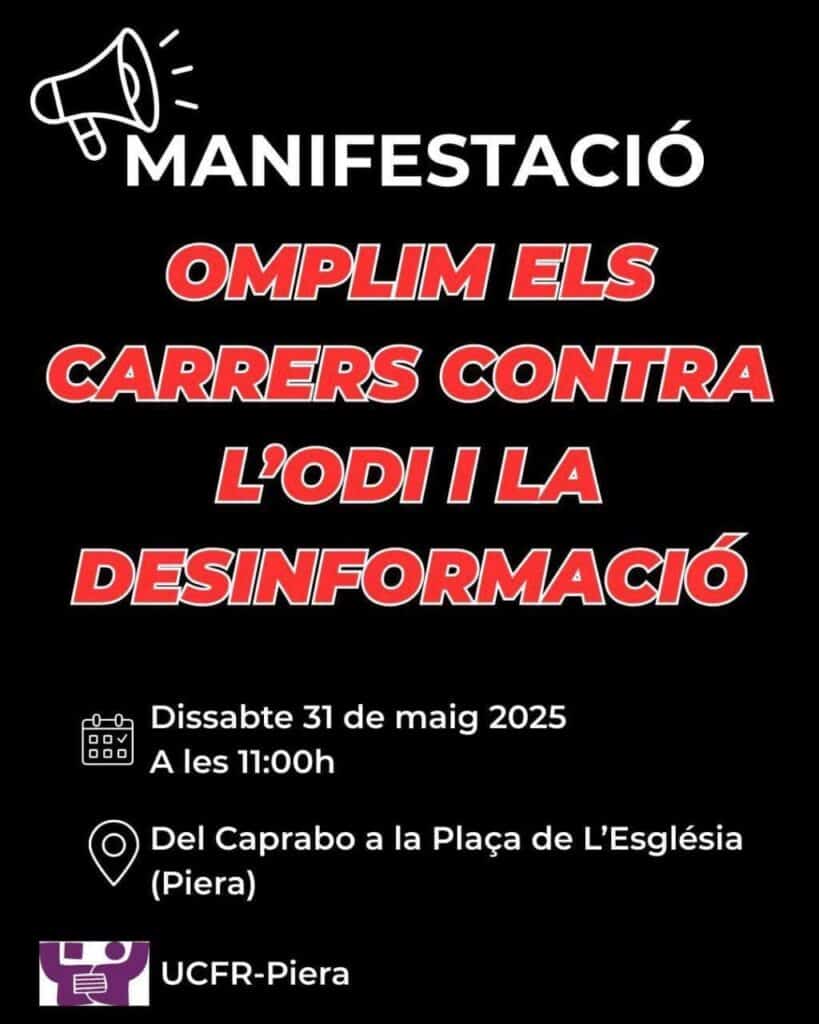 La delegació a Piera d’Unitat Contra el Feixisme i el Racisme ha convocat una manifestació per al proper 31 de maig a les 11h després de la setmana de tensió pels aldarulls produïts al municipi, que van involucrar joves locals i menors tutelats que resideixen en un centre del municipi. La convocatòria porta per lema Omplim els Carrers contra l’odi i la desinformació.