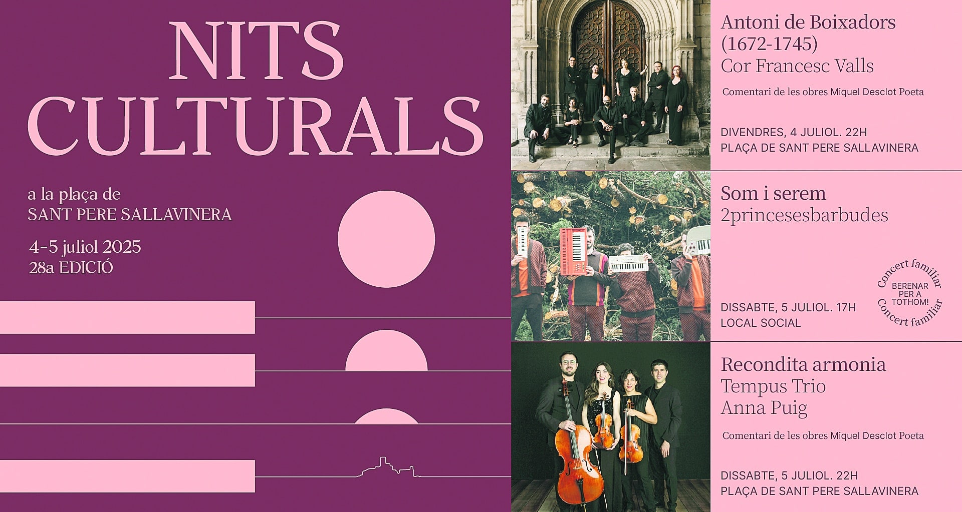 El dissabte, el municipi acollirà dos concerts, un primer a les cinc de la tarda al local social de la mà de Som i serem amb 2princesesbarbudes; i a les deu de la nit a la plaça de Sant Pere Sallavinera serà el torn de Recondita armonia amb Tempus Trio i Anna Puig fent comentari de les obres de Miquel Desclot Poeta.