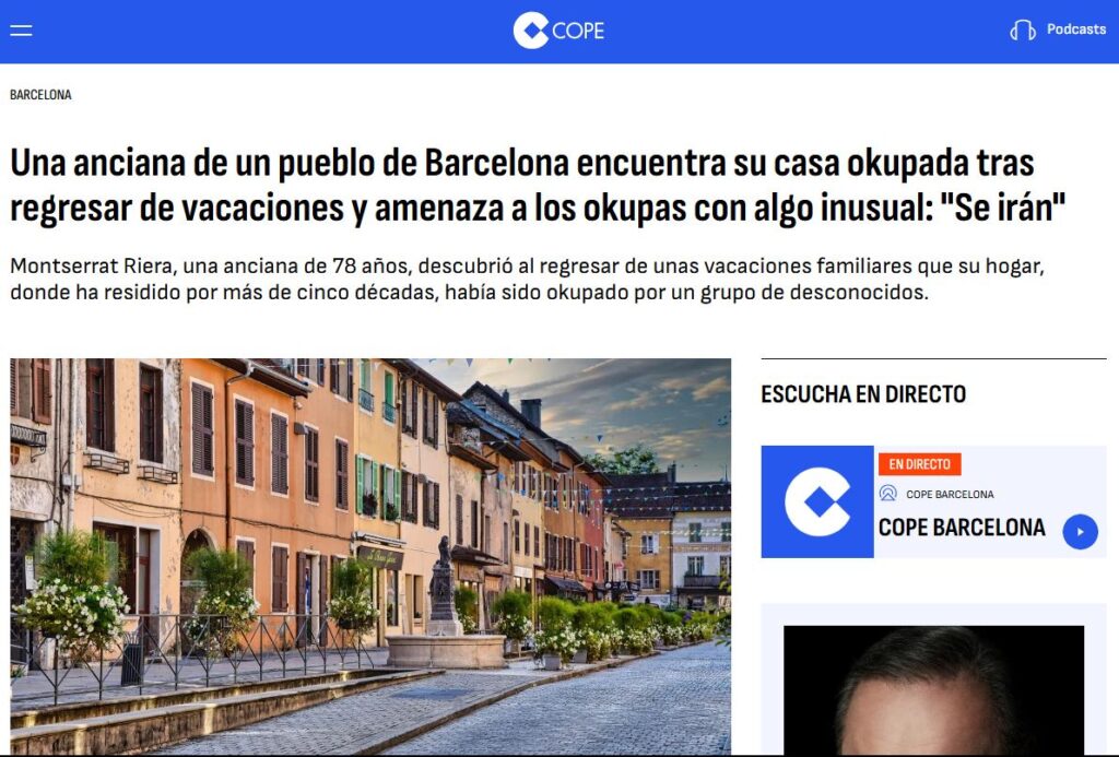 Dimarts 26 d’agost, el mitjà espanyol COPE va publicar una notícia a on asseguraven que a una anciana de setanta-vuit anys li havien okupat la casa a Sant Martí de Tous després d’anar-se’n de vacances. Segons el mitjà, aquesta anciana anomenada Montserrat Riera, hauria llançat un rusc de vespes a dins la casa per tal de fer fora als okupes, i aquests l’haurien denunciat. La informació firmada pel periodista José Miguel Cruz, se centra en una suposada dificultat legal de la propietària a l’hora de recuperar el pis.