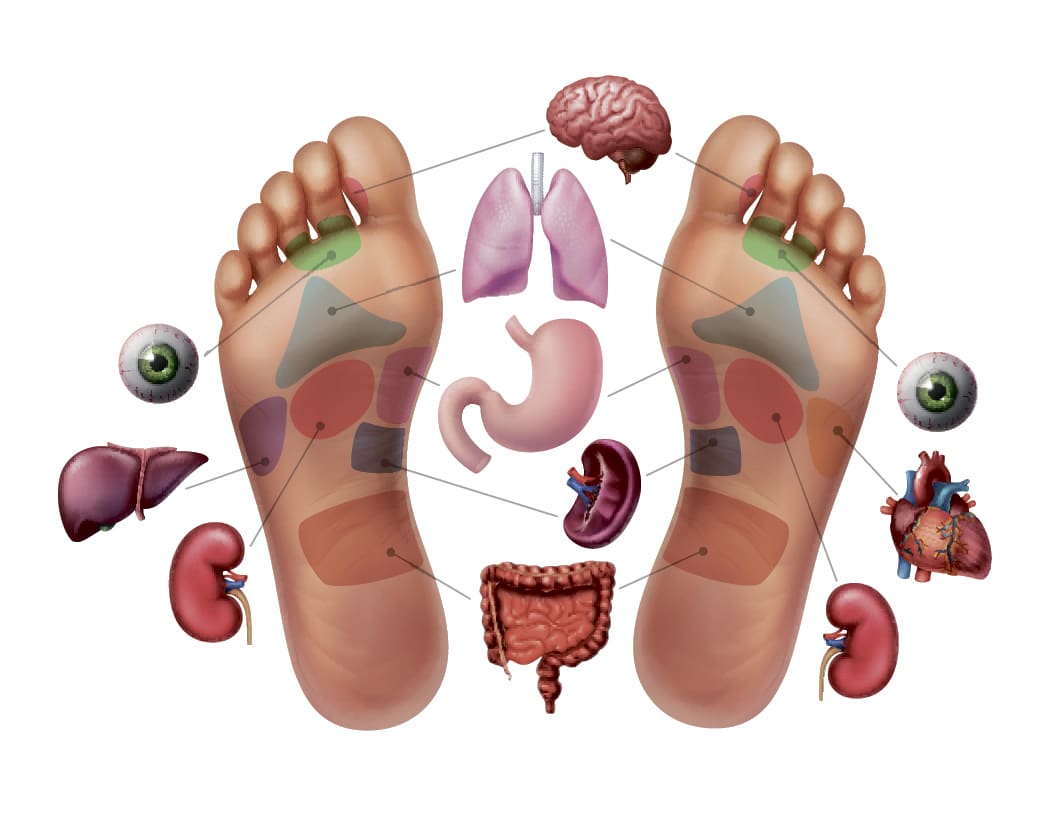- Peus. Els punts reflexos del peu es corresponen amb diferents òrgans i parts del cos, com el cor, el fetge, els ronyons, i altres.