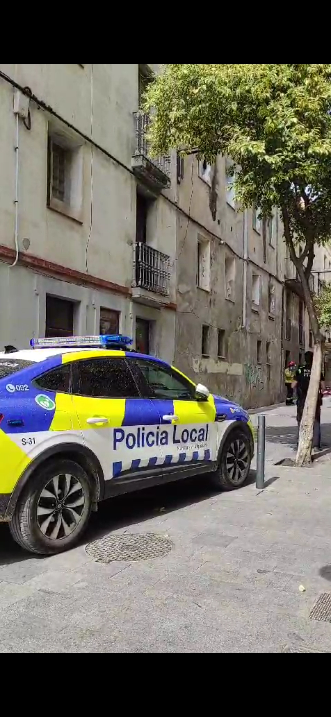 Una placa de l’arrebossat, entre la segona i la tercera planta, ha caigut a la via pública. Els Bombers de la Generalitat s’han desplaçat amb l’auto-escala per assegurar la resta de l’arrebossat i evitar que caigui a la via pública.