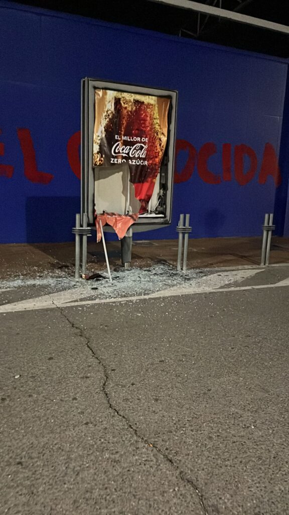 D’altra banda, també havia provocat desperfectes en diversos vidres als accessos a l’hipermercat Carrefour, que apareix entre els establiments criticats per diverses associacions pel seus vincles amb l’Estat israelià, i també en un panell publicitari.