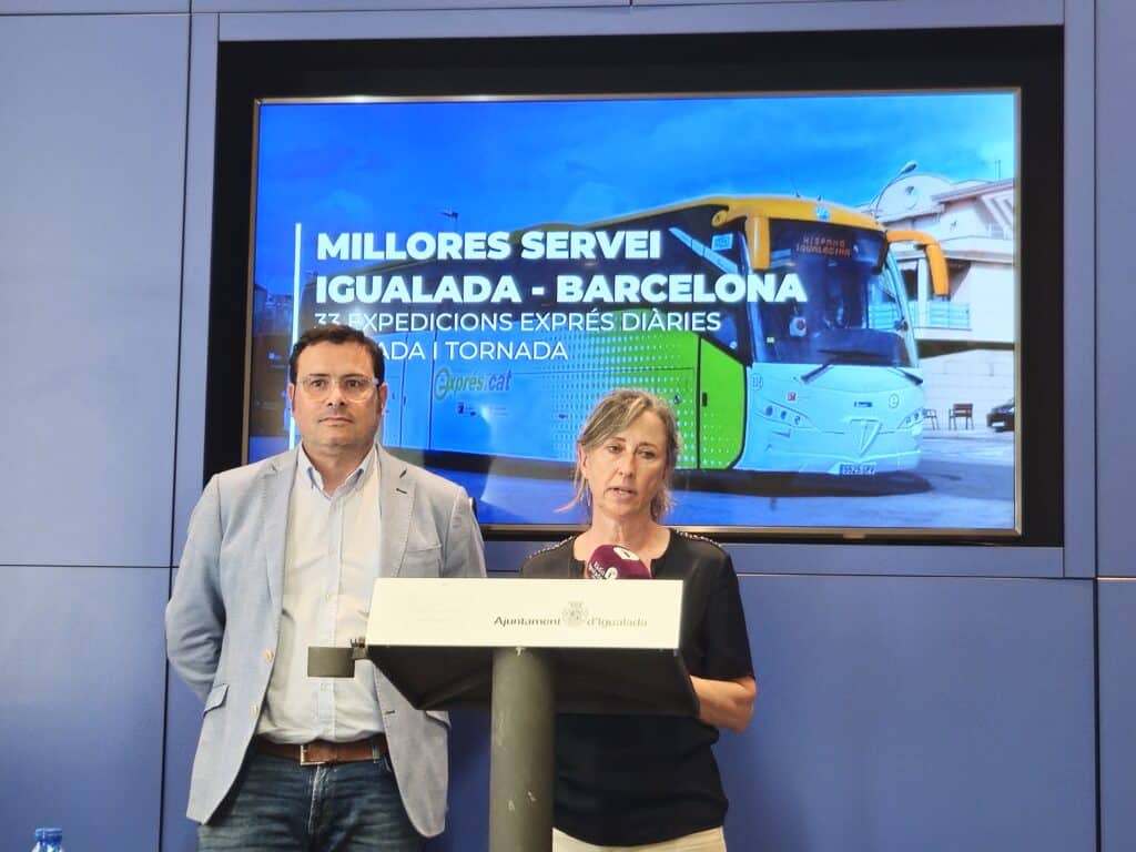 El Departament de Territori de la Generalitat ha anunciat aquest dilluns una sèrie de millores en les línies de bus Igualada-Barcelona i Igualada-UAB. Susi López, Directora General de Transport Públic, i Miquel Vives, regidor d’Urbanisme del consistori igualadí, les han presentat a Igualada durant la tarda de dilluns.