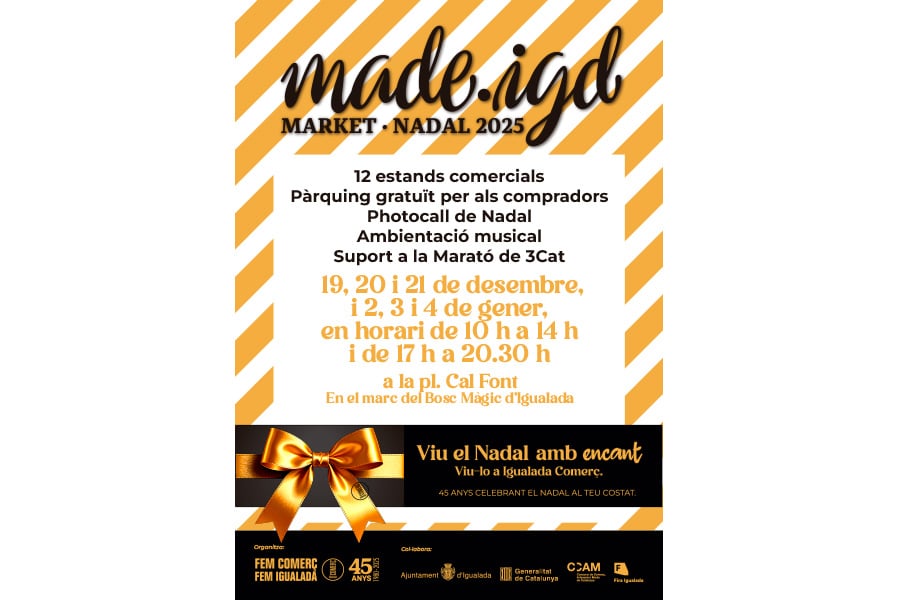 El MADE.IGD – Market Nadal 2025 tindrà lloc els caps de setmana 19, 20 i 21 de desembre, i 2, 3 i 4 de gener, en horari de 10 h a 14 h i de 17 h a 20.30 h.