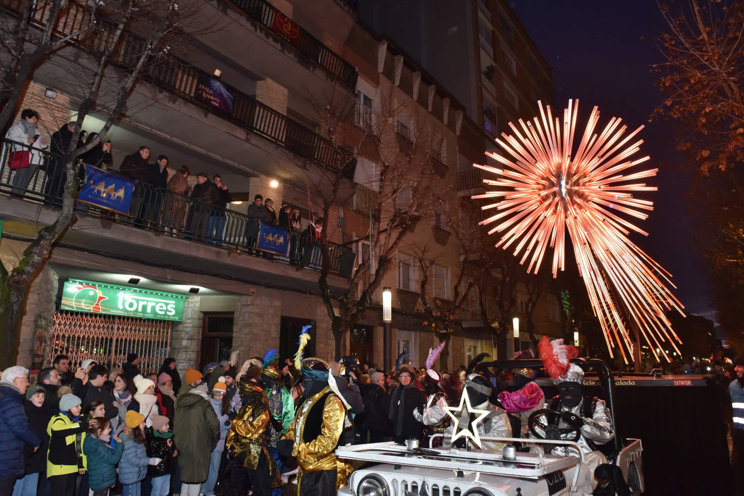 El polític basc Aitor Esteban, convidat de la Festa de Reis 2026, rebent als Reis al costat de l’alcalde Castells. © Joan Guasch