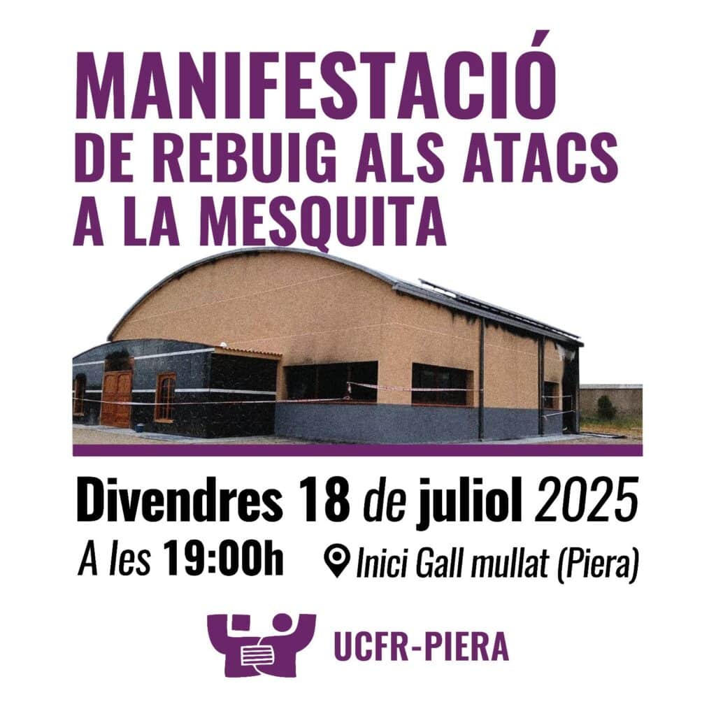 La Unitat contra el feixisme i el racisme de Piera ha convocat per demà divendres a les set de la tarda al Gall Mullat de Piera, una manifestació per mostrar el rebuig envers l’atac de la mesquita.