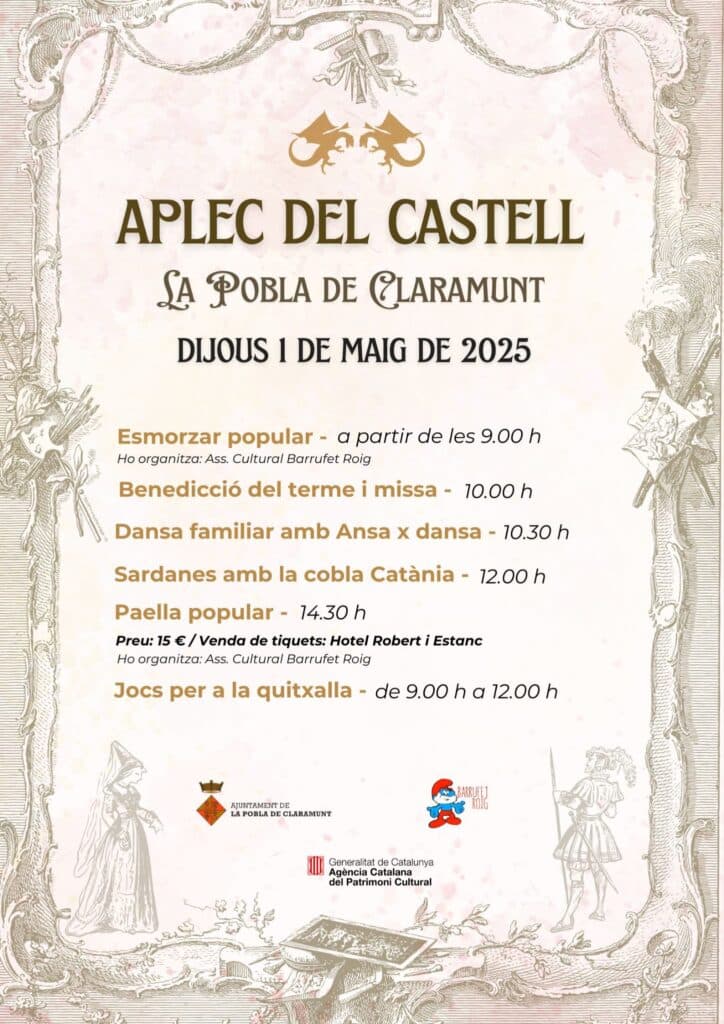 El Castell de Claramunt acull novament l’1 de maig de 2025 el tradicional aplec que organitzen l’entitat juvenil Barrufet Roig i l’Ajuntament de la Pobla de Claramunt. L’activitat s’inicia el pròxim dijous a les 9h amb l’esmorzar popular al qual seguirà a les 10h la benedicció del terme i la missa i a les 10.30h una activitat de dansa familiar amb Ansa x Dansa.