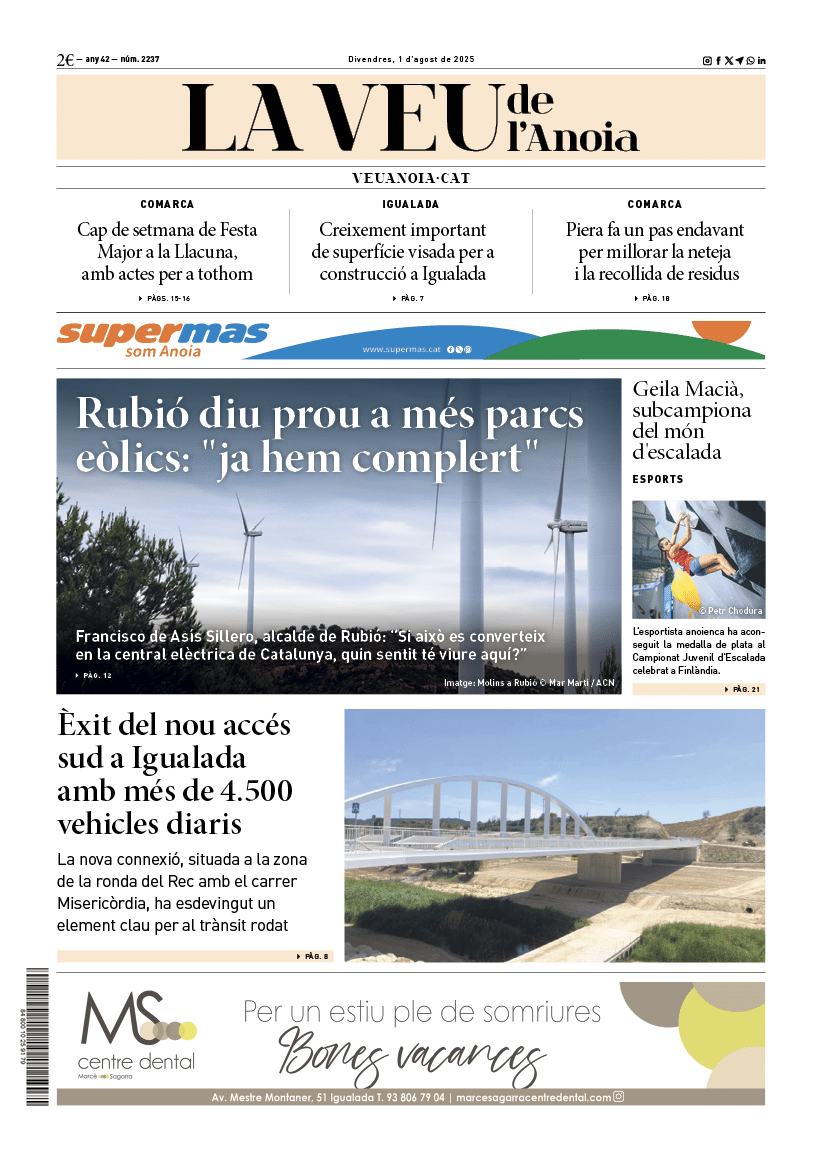 Un divendres més, arriba una nova edició en paper de La Veu de l’Anoia, el setmanari de referència a tota la comarca. Consulta la portada de La Veu de l’Anoia nº2237, de l’1 d’agost de 2025.