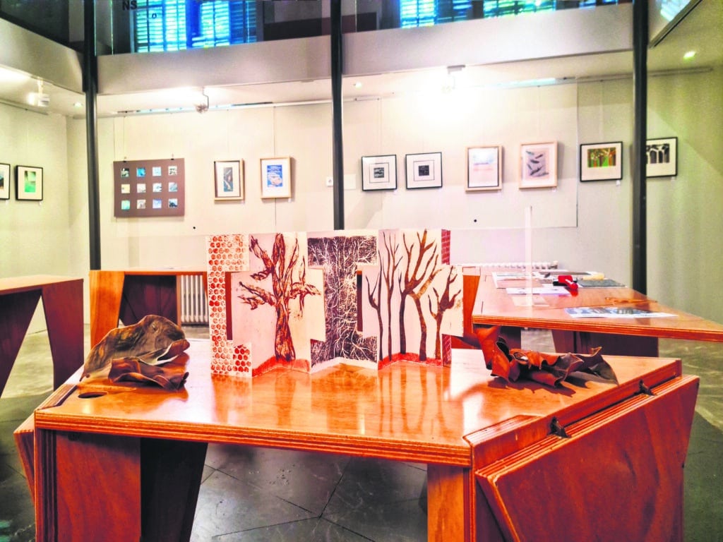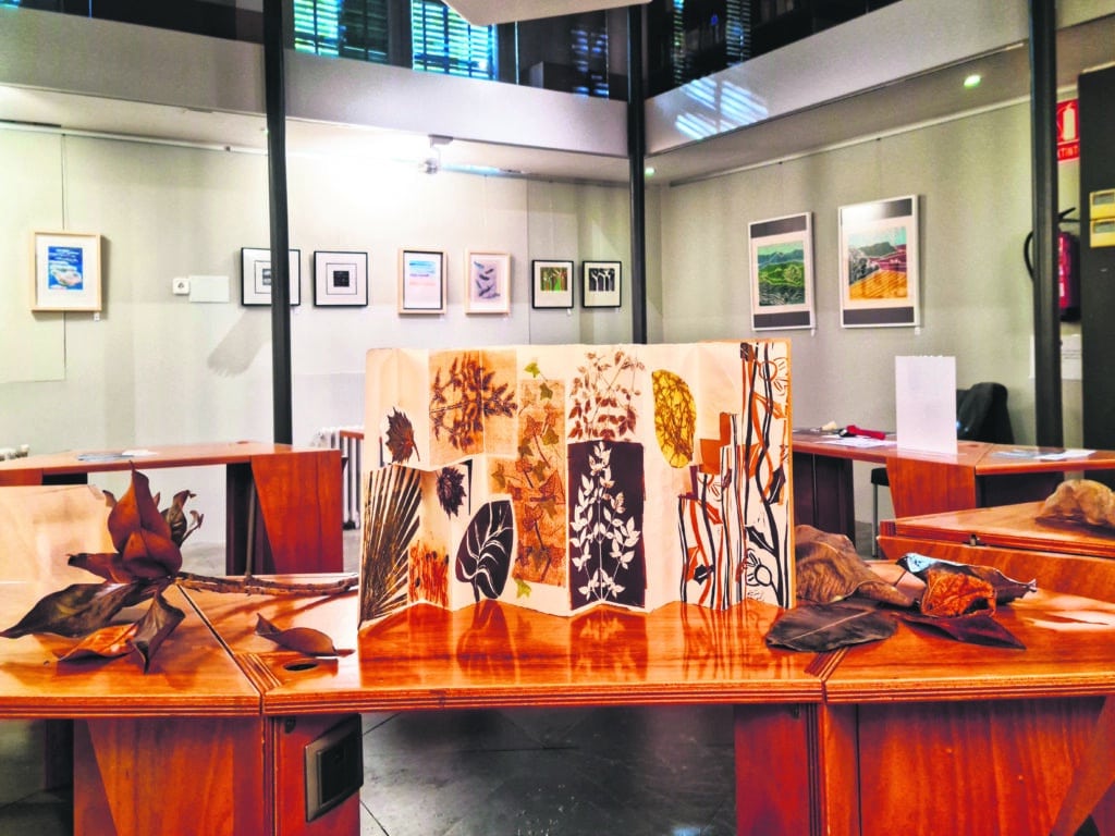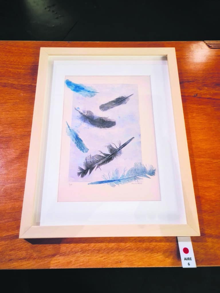 A partir d’un recorregut per diverses tècniques del gravat: l’aiguafort, l’aiguatinta, el monotip, el gofrat … , cadascuna amb la seva pròpia entitat; les obres de “Terra, Mar i Aire” fonamenten una mena de conversa entre tinta, metall i paper, proposant un llenguatge summament captivador. Efectivament, el monotip es posiciona davant d’aquell instant irrepetible en què la tinta es mou sobre el paper en un gest segellat per sempre, i on l’autora estampa empremtes que són la memòria de la Natura; el gofrat dona pas a un relleu quasi mut, sense tinta, i servint-se de la pressió i el volum el paper respira llums i ombres que es llegeixen amb els dits. Quant a l’aiguafort: el metall es deixa rossegar. La mà dibuixa, l’àcid grava, i la línia es va dibuixant plena de vida i matisos. I, l’aiguatinta és com el vel de la llum. El vernís i l’àcid creen atmosferes suaus, degradats i ombres que es dissolen com boires sobre la planxa. Realment, i tal i com remarca Oliva: “Es tracta de processos que fan possible la repetició d’un mateix gest en diferents estampes, com si l’eco de la imatge insistís a perdurar”.