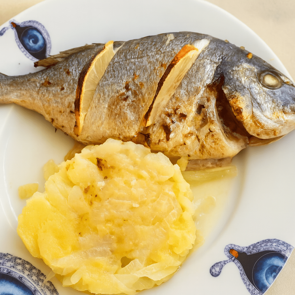 Serviu l’orada al plat i, al darrere, empleneu un aro de metall amb el farcit de patata i ceba per donar-li una presentació elegant i ordenada.