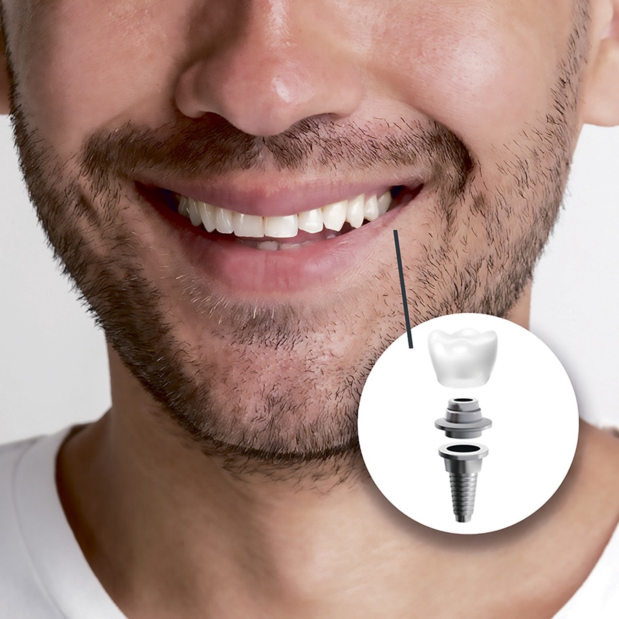 Un implant dental és una petita estructura de titani biocompatible que substitueix l’arrel d’una dent perduda i serveix de base per col·locar-hi una corona que imita la dent natural.
