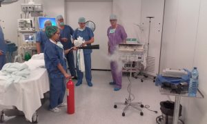 La pràctica va consistir en l’actuació davant d’un connat d’incendi d’un aparell elèctric durant una intervenció quirúrgica simulada. Es va realitzar la detecció, l’avís i l’actuació i fent l’evacuació del pacient.