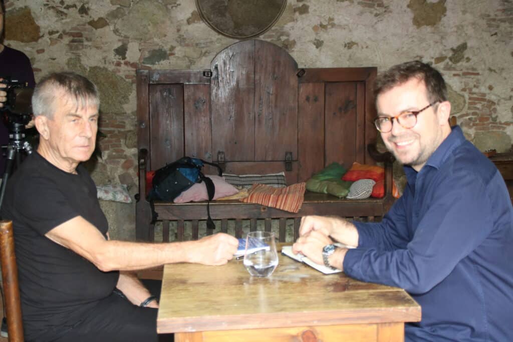 Un dels grups més grans debat sobre temes diversos mentre els seus membres es van mirant la carta. Fa uns quants mesos que van començar a peregrinar a Montserrat els dies 11. Venen de llocs molt diferents de la geografia catalana: els Vallès, Osona, Lleida ciutat o Igualada. Hi ha algunes cares conegudes. En un extrem de la taula, Arnau Tordera, músic i cantant d’Obeses. A l’altre, el músic igualadí White Pèrill.